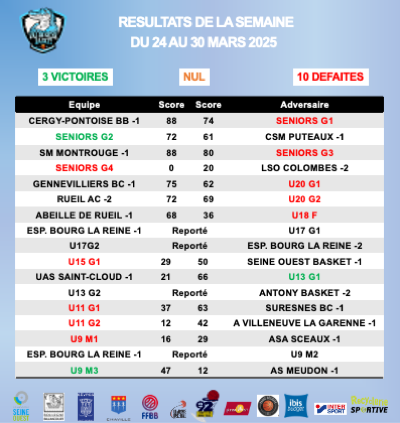 Résultats de la semaine du 24 au 30 mars 2025