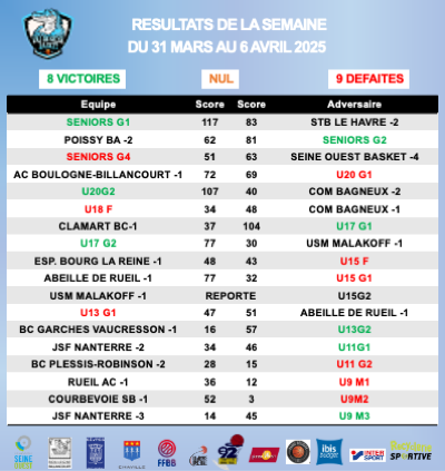 Résultats de la semaine du 31 mars au 6 avril 2025
